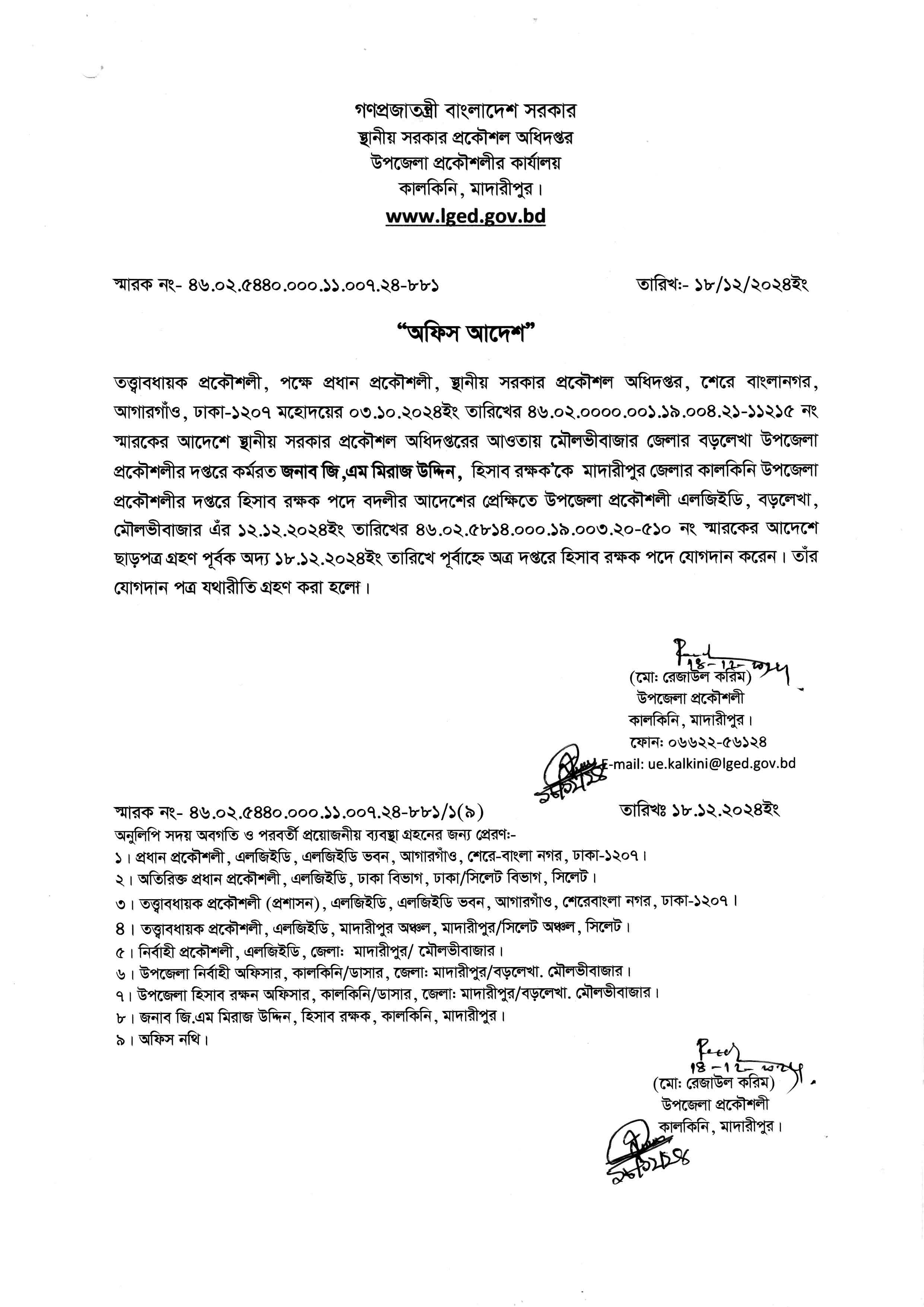 | ১ | হিসাব রক্ষক জনাব জি.এম মিরাজ উদ্দিন এর যোগদান অফিস আদেশ (স্মারক নং- ৪৬.০২.৫৪৪০.০০০.১১.০০৭.২৪-৮৮১) | | ১৮-১২-২০২৪ | দেখুন | |
